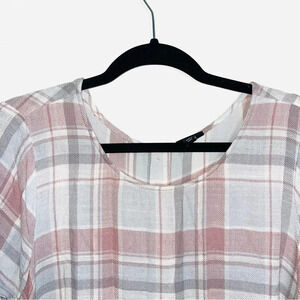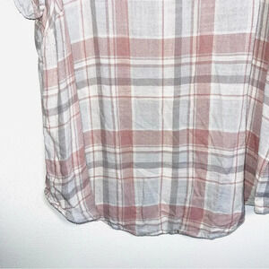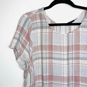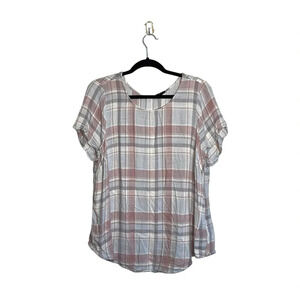 Torrid Abbey light pink & gray plaid print woven button back top. In excellent condition! Crew neckline. Short sleeves. Rounded bottom hem. Button back details. Small split on bottom. Light gray, pink & white plaid print. Size 1X.