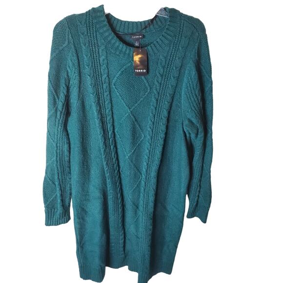 Acrylic cotton sweater dress by Torrid. Hits at the knee. Color is botanical garden which is similar to a dark green with a hint of teal.