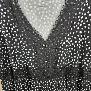 Embrace effortless style with this Torrid Babydoll Button-Front Top in a classic black and white polka dot pattern. Featuring a flattering v-neckline and delicate lace trim, this top combines feminine details with everyday comfort. The short sleeves and babydoll silhouette provide a relaxed, yet stylish fit, making it perfect for pairing with jeans or skirts for a chic look.
