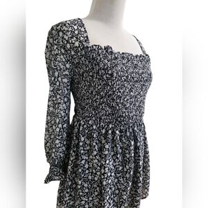 Torrid babydoll top, crafted from lightweight chiffon fabric. Featuring a smocked upper, square neckline, and 3/4 smocked sleeves, this top combines comfort with a stylish, flowy silhouette. The subtle floral print in black and white adds a romantic touch, perfect for casual or dressy occasions