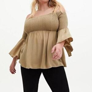 Torrid Babydoll Crinkle Gauze Smocked Cold Shoulder Top in Olive