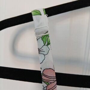 This Torrid halter top features a bold floral print with soft pastel tones on a white background. Adjustable straps and a breezy silhouette make it a flattering and easy-to-wear piece for warmer days.