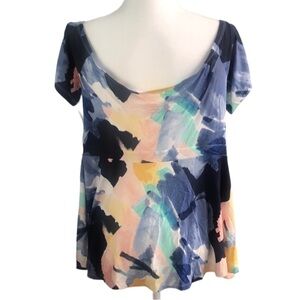 Top features an off the shoulder design, round neck, keyhole tie front with an abstract multi-color brush stoke pattern. Peplum hem. Cap sleeves.