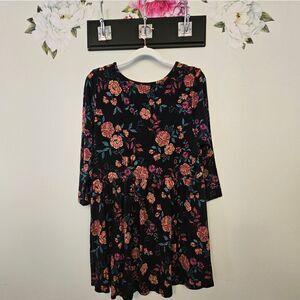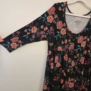 One of our favorite layering pieces is this Super Soft floral knit tunic, featuring 3/4 sleeves, an allover floral design, and a hi-lo hem.