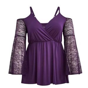 Stylish purple top with cold shoulder design and lace sleeves. Perfect for a chic look.