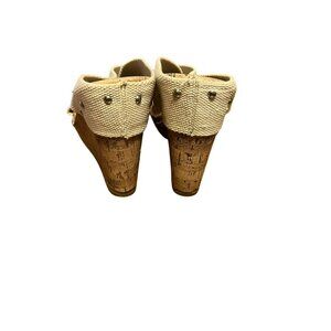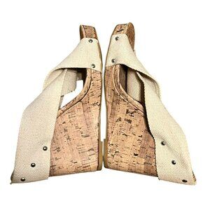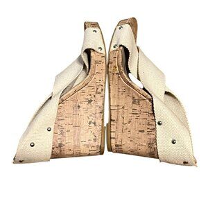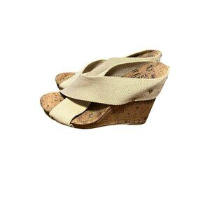Elegant beige sandals with crisscross straps. Cork-style wedge for added height.