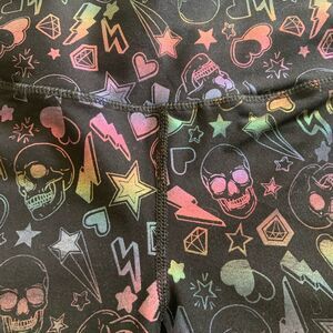 These Torrid bike shorts feature a striking skull, heart, star, lightning bolt, diamond colorful print on a sleek black background, offering a smooth finish and a goth inspired design. The knee-length style provides comfort and versatility, making them a standout addition to any wardrobe.
