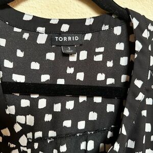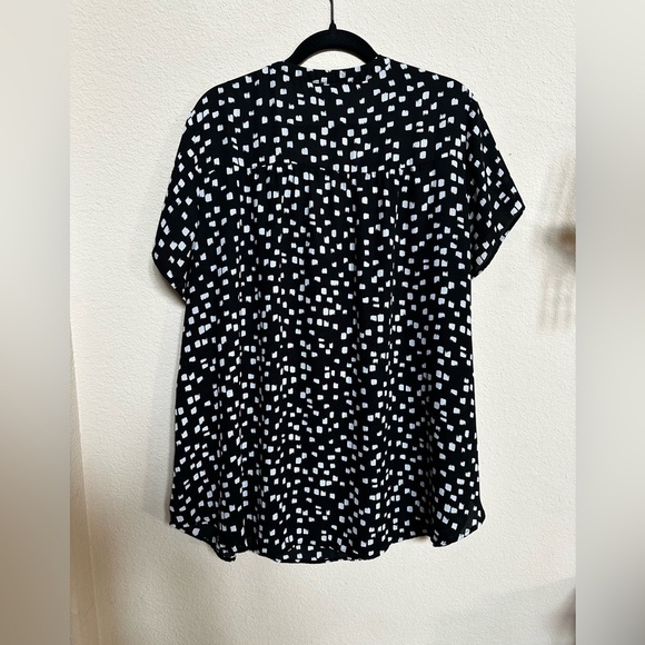 Stylish black blouse featuring white dot pattern. Perfect for versatile wear.