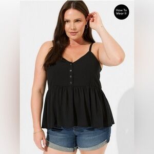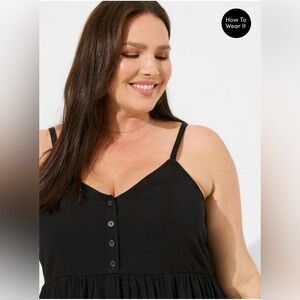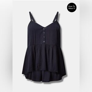 Keywords: Torrid, cami, tank top, peplum, plus size, black, button front, adjustable straps, summer, casual, flattering, women
