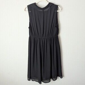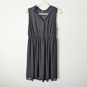 Chic black midi dress with button-front detail. Sleeveless design. Perfect for versatile styling.
