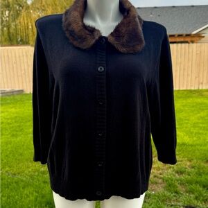 Chic black cardigan with a soft faux fur collar. Ideal for a stylish look.