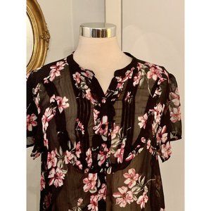 This Torrid black chiffon blouse features a beautiful floral pattern that is perfect for a wedding or party occasion. The blouse has short sleeves and a round neckline with a relaxed fit that makes it comfortable to wear. The sheer chiffon material gives it a feminine and hippie vibe, while the ruffle and pintuck features add some extra texture to the piece.