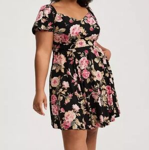 READ THE ENTIRE DESCRIPTION FIRST - Torrid Black Floral Challis Mini Dress Sz 0X L/XL. Can be worn Off Shoulder or as Puff Sleeves with stretch elastic. Smocked back with sweetheart neckline. Very stretchy to fit and lightweight and flowy. Flattering fit and flare silhouette and HAS POCKETS!! Excellent condition.