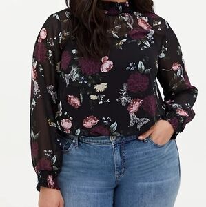 Torrid Black Floral Chiffon Mock Neck Blouse 1X