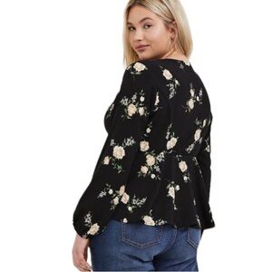 Torrid black floral crepe surplice midi peplum blouse. Button from detail. Elastic sleeve openings. Size 5 = US 28. 28” armpit to armpit laid flat. 29” shoulder seam to hem. Very good pre owned condition