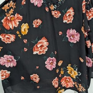 Elegant women's top featuring a striking floral design on a black background. The pink and orange flowers add a vibrant touch, perfect for any occasion.