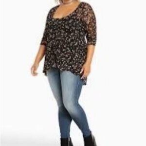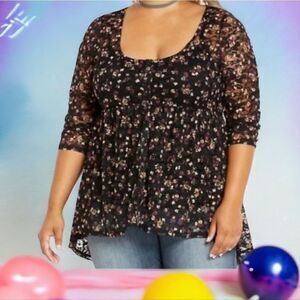 Torrid Black Floral Lace Sheer Mesh Peplum Babydoll Blouse Button Front Top 2/2X