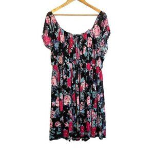 Keywords: Torrid, plus size mini dress, 3X black dress, floral mini dress, short sleeve dress, casual spring dress, sweetheart neckline dress, women's short dress, polyester spandex dress, machine washable dress, pre-owned Torrid dress, black floral dress, plus size fashion, Torrid 3X dress, women's plus size clothing