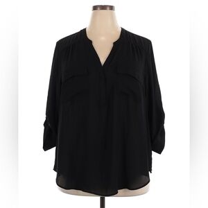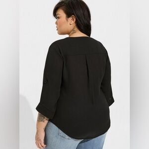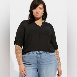 The Torrid Harper blouse in black is a versatile, flowy, and lightweight top designed with a split neckline and a button placket. It features 3/4 roll-tab sleeves, chest pockets, and a shirttail hem. The fabric is a georgette woven material, known for its breathability and durability. It's a popular choice for both casual and workwear due to its comfortable fit and professional appearance.