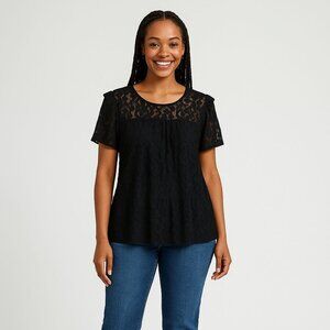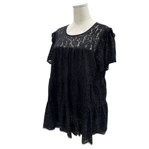 This beautiful Torrid black lace top features an allover floral lace overlay with a soft, flowy silhouette and flutter short sleeves. The sheer lace yoke and tiered babydoll fit make it flattering and feminine. The piece offers an elegant gothic-coquette vibe that pairs perfectly with jeans, skirts, or leggings.