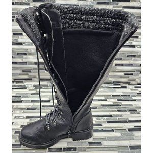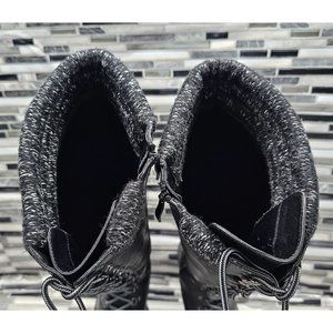 These black heeled boots from Torrid feature a striking lace-up design and a rugged, durable sole. Crafted with a textured upper, they offer both style and functionality, perfect for any occasion.