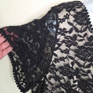 Excellent pre-owned condition. No flaws to note. Women's plus size Torrid Black Nude Lace Skater V-Neck Dress Short Sleeve Size 3 3x.
