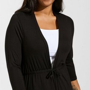 Available for sale is this Torrid Super Soft Tie Front Cardigan. It is black with 3/4 sleeves and is NWT. Available in size 5 ( 5X or size 28 ). Open-front design. Ideal for layering.