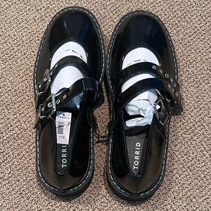 Stylish black patent leather Mary Jane shoes with double buckle straps. Perfect for a chic look.
