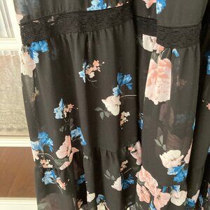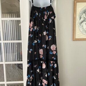 Black, pastel pink and blue floral print maxi dress with tiered ruffled hem