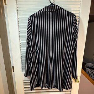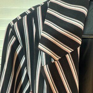 A sleek, polished, and stretchy Torrid longline blazer featuring a black base with subtle pinstripes in pink and white. This single-button style creates a clean, tailored silhouette, perfect for work, events, and elevated everyday outfits. Practically new — shows no visible signs of wear or washing.