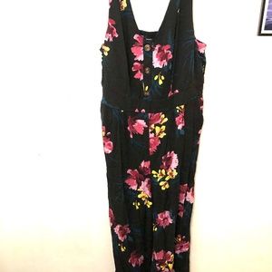 This jumper is black with blue, pink, and yellow flowers. It has fake buttons down the chest area. They are just for show. The back is smocked and allows a nice stretch for your chest. The straps are adjustable and it has pockets.