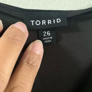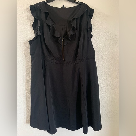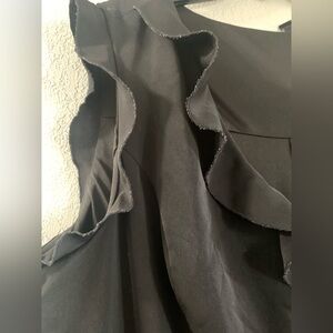 Chic black mini dress with ruffle neckline. Perfect for versatile styling. This dress has definitely been loved. Lint has started the gather along the ruffles at the top. Please view all photos. Everything thing else is in good condition!