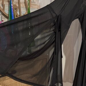 Elegant black top with ruffled details. Long sleeves and open front design. Perfect for layering.