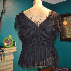 Elegant black top with ruffled sleeves. V-neck design. Perfect for any occasion.
