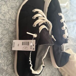 Chic black sneakers. Cream laces add contrast. Ideal for everyday wear.