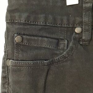 Mid rise black denim shorts with zip and button closure, 5 pocket design, belt loops and cut out embroidered crochet trim.