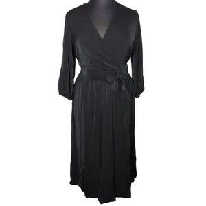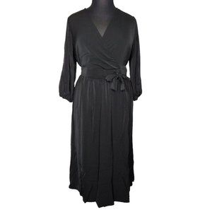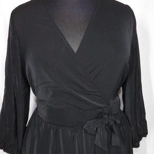 Torrid Plus Size 1X Black Tea Length Studio Studio Crepe De Chine Surplice Dress With Pockets. Dress has decorative tie at the waist, it does not tighten the dress at all. Button closure at back of neckline but dress easily slips on over the head due to the style. Elastic at sleeve hem.