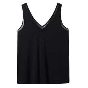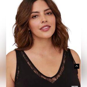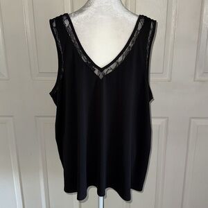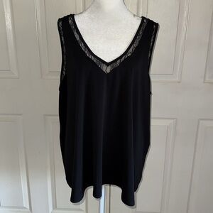 Torrid black studio crepe jersey lace inset double v neck tank top. Size 3 = US 22/24. 25” armpit to armpit laid flat. 26 5/8” shoulder to hem. Very good pre owned condition
