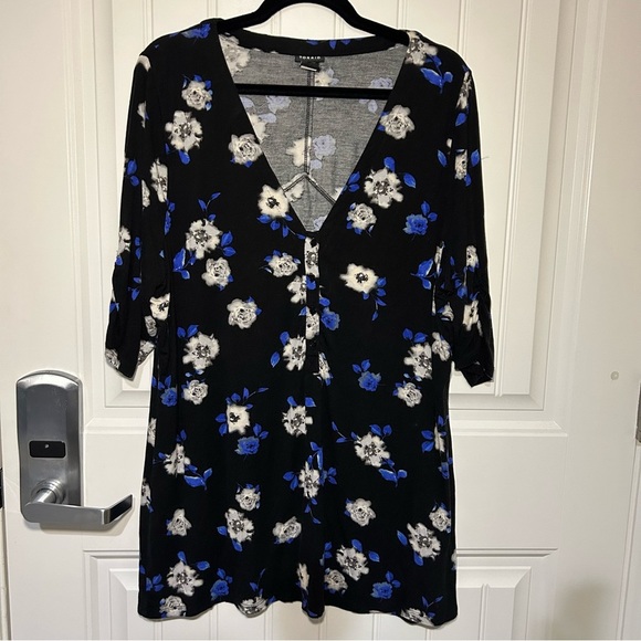 Torrid Black White & Blue Floral V-Neck Short Sleeve Blouse. Has some pilling on the front and around the armpits. As shown in photos above. In otherwise great preowned condition. Feel free to make a reasonable offer through the offer button!