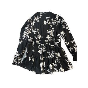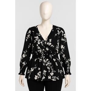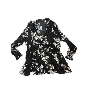 Beautiful Torrid black and white floral blouse in women’s size 2 (Torrid Plus). Features long sleeves with smocked cuffs, smocked waist for a flattering fit, and tiered hem. Lightweight sheer polyester fabric. Perfect for work, date night, or casual wear