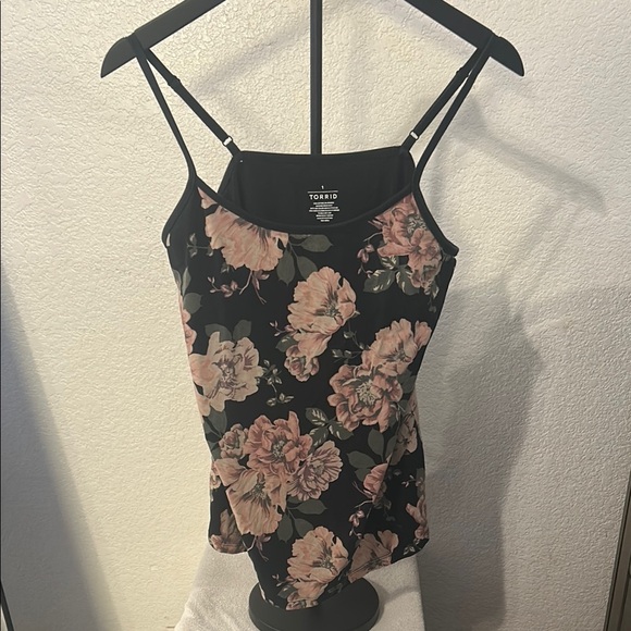 This Torrid camisole features a striking black base adorned with romantic pink floral prints, offering a vintage charm. The sleeveless design with thin, adjustable straps ensures a perfect fit, while the stretchy material provides comfort and style.