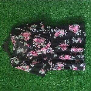 This Torrid blouse features a captivating black base with vibrant pink floral patterns, offering a chic and feminine look. The cap sleeves and ruffled peplum design add a touch of elegance, making it a versatile choice for both casual and formal occasions. Crafted from a soft, flowing fabric, it ensures comfort and style throughout the day. pre-owned smoke-free