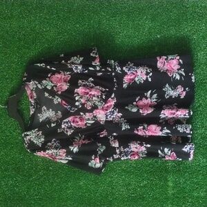 This Torrid blouse features a captivating black base with vibrant pink floral patterns, offering a chic and feminine look. The cap sleeves and ruffled peplum design add a touch of elegance, making it a versatile choice for both casual and formal occasions. Crafted from a soft, flowing fabric, it ensures comfort and style throughout the day. pre-owned smoke-free