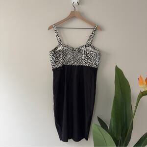 This striking mini dress features a bold black and white animal print bodice with a sleek black skirt, perfect for a cocktail night out. The sleeveless design and sweetheart neckline add a touch of elegance to its sheath silhouette.