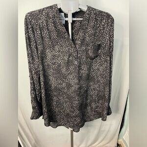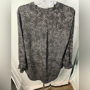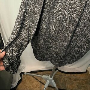 This elegant blouse features a relaxed fit with a mandarin collar and long sleeves, crafted in a chic black and white color scheme. The flowing fabric and buttoned style make it a versatile piece for both casual and formal occasions.