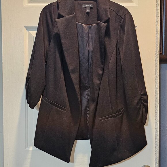 Torrid, Blazer, Black Size 2. Has a single button and great to dress up or dress down. It does have one snag. Please see the image with my fingernail for size reference. Never worn.