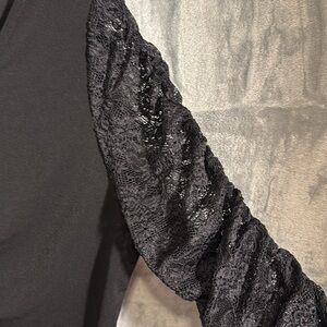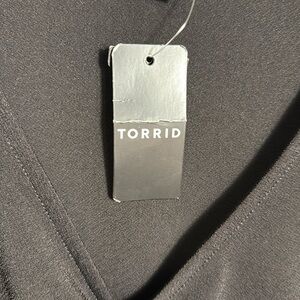 The Torrid black blouse showcases a chic ruched and ruffled design on its 3/4 sleeves, offering a touch of elegance. Crafted with a soft, draping fabric, this top provides a flattering silhouette perfect for any occasion. This torrid top is in new condition