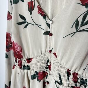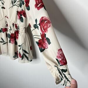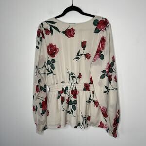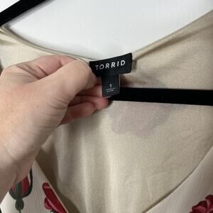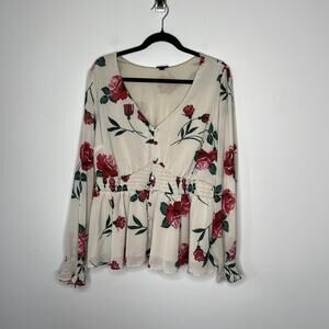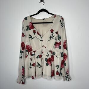 Torrid Blouse Womens 1X Cream Floral Rose V Neck Button Smocked Waist Plus Size