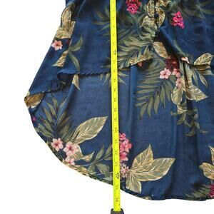 Lovely blue High Low Top with an all-over floral and leaf pattern in shades of green, pink, and white