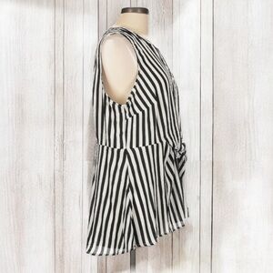 •This stylish sleeveless blouse features a classic black and white striped pattern and a flattering V-neckline.